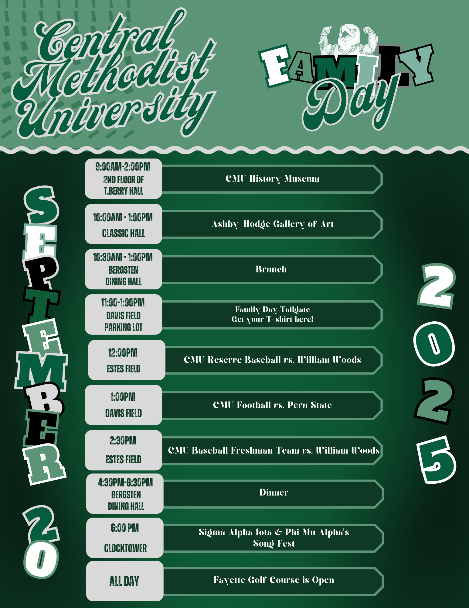 Central Methodist University's Family Day delivers an opportunity for families of Central students to visit, have some fun, and immerse themselves in the CMU experience. There will be a variety of events on campus, including a chance to view the current show at our Ashby-Hodge Gallery of American Art, as well as athletic events, tailgating, and our Sigma Alpha Iota and Phi Mu Alpha Song Fest. There's something for everyone! Saturday will be full of activities, starting with a chance to view the CMU History Museum, located on the second floor of T. Berry and opening at 9 a.m. At 10 a.m. the Ashby-Hodge Gallery of Art, located at Classic Hall, will be open. Brunch will be served from 10:30 a.m. to 1 p.m. at the Bergsten Dining Hall, and starting at 11 a.m., the tailgate area will be open, where visitors can purchase a T-shirt. The CMU reserve baseball game against William Woods University begins at 12 p.m. Kick-off for the football game against Peru State Universty is shortly after at 1 p.m. Tickets can be purchased in advance at www.cmueagles.com